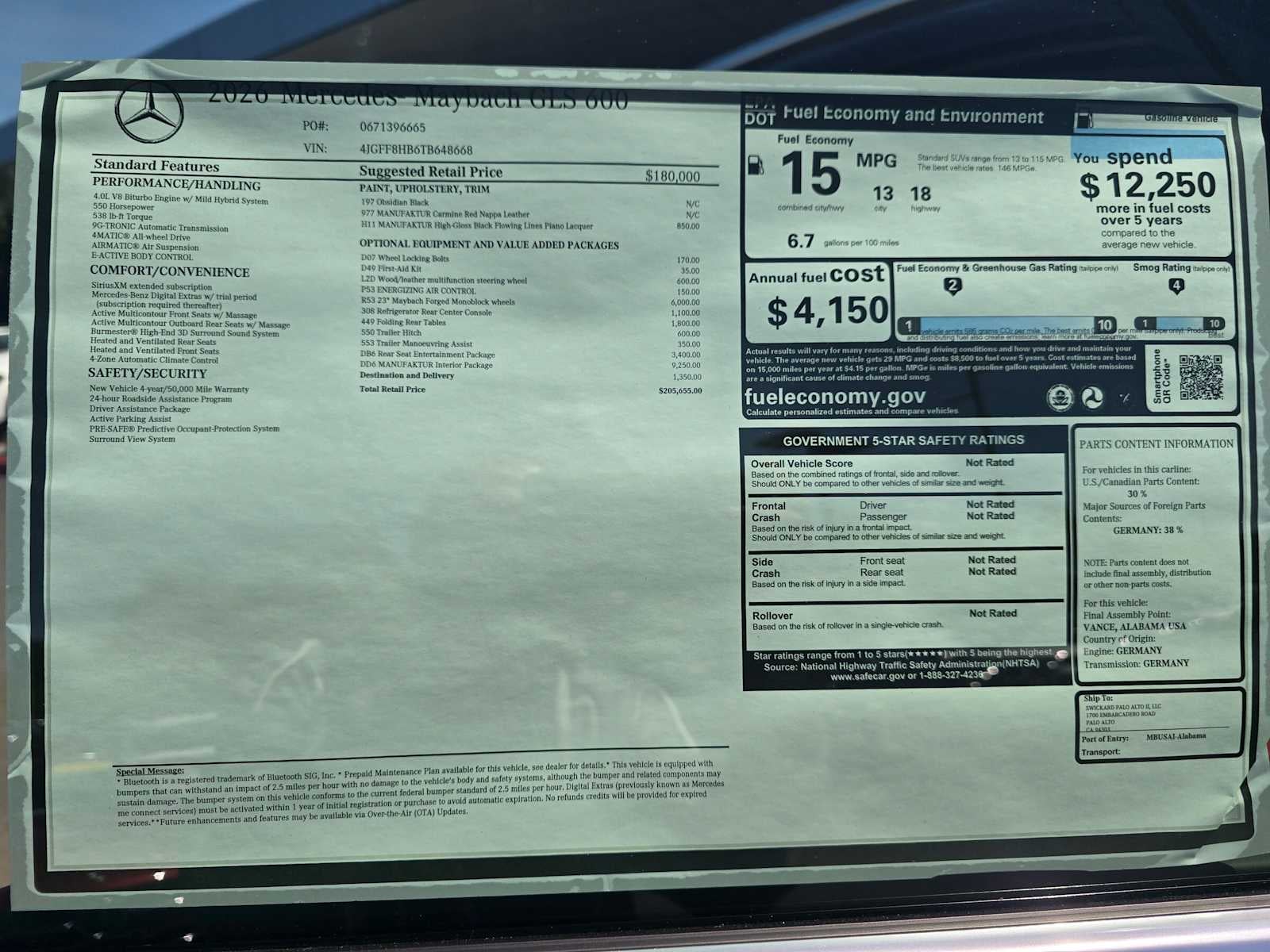 MANUFAKTUR SIGNATURE INTERIOR PACKAGE Headrest Cushions w/Maybach Logo, Illuminated Door Sills, MANUFAKTUR Lettering on Wood Trim (Front), MANUFAKTUR High-Pile Floor Mats, WHEELS: 23 X 9.5J FR & 23 X 11.5J RR MONOBLOCK Maybach 5-hole forged, Tires: 285/40R23 Front & 325/35R23 Rear, REAR SEAT ENTERTAINMENT PACKAGE Wireless Headsets, MBUX High-End Rear Seat Entertainment System, TRAILER HITCH Increased Towing Capacity, WOOD/LEATHER STEERING WHEEL W/PIANO BLACK LACQUER, Leather Seats, Navigation, Sunroof
