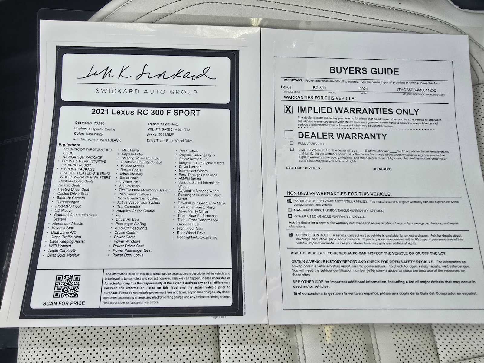 NAVIGATION PACKAGE dynamic navigation (complimentary for 3 years of ownership), dynamic voice recognition, 10.3 color multimedia display, enhanced voice command, remote touchpad, HD Radio w/iTunes tagging (complimentary traffic and weather), Lexus Enform Destination Assist, Included for the first 3 years of ownership, Electrochromic Rearview Mirror w/HomeLink, Lexus Enform Enform App Suite 2.0, Complimentary for up to the first 3-years of ownership, Yelp, iHeartRadio, Pandora, Slacker, NPR One and Amazon Alexa, MOONROOF W/POWER TILT/SLIDE, FRONT & REAR INTUITIVE PARKING ASSIST clearance and back sonar, F SPORT HEATED STEERING WHEEL W/PADDLE SHIFTERS, F SPORT PACKAGE F SPORT front fascia, grille and exterior badging, unique front bumper and rear valance, dark gray streamline trim, drive mode select (Eco, Normal, Sport S, Sport S+, Snow and Custom), 2-piece front brake rotors w/high-friction brake pads w/black brake calipers and active sound, Heated Driver Seat, Cooled Driver Seat, Back-Up Camera, Turbocharged, iPod/MP3 Input
