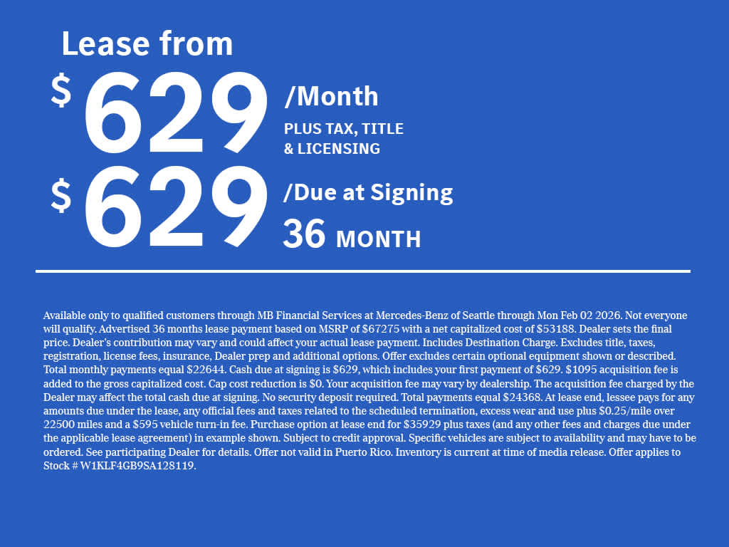 NATURAL GRAIN BROWN MAPLE WOOD TRIM W/ALUM LINES: Center Console in Natural Grain Maple Wood, aluminum lines, WHEELS: 19 AMG® 5-TWIN-SPOKE LIGHT-ALLOY W/BLACK: 19 x 8.5J front and 19 x 9.5J rear, Tires: 245/45R19 Fr & 275/40R19 Rr, VENTILATED FRONT SEATS, WINTER PACKAGE: Heated Steering Wheel, Winter Package Factory Code, Heated Windscreen Washer System, Navigation, Power Liftgate, Back-Up Camera, Satellite Radio, iPod/MP3 Input SPC Exchange Privilege for 7 days or 500 miles, whichever comes first, Each Certified vehicle must pass a rigorous inspection of over 165 points, 24-Hour Roadside Assistance includes trip routing, trip interruption coverage and technical help, A network of over 300 Mercedes-Benz dealers will support your Certified Mercedes-Benz, Carfax Vehicle History Report, Balance of New Car Warranty plus 1 year/unlimited miles extended Limited Warranty Welcome to Mercedes-Benz of Seattle, your local, family-owned Mercedes-Benz dealer near Bellevue, WA. We are proud to be part of the Seattle community and have called it home since 1957. At Mercedes-Benz of Seattle we are always looking for ways to give back and sponsor local schools and the rodeo. But we dont just serve Seattle. In fact, our customers visit us from Tacoma, Edmonds, Lynnwood, Kirkland and even Redmond, WA.