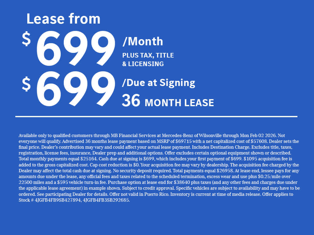 “A 2.25% surcharge is applied to all credit card transactions. This fee is not greater than our cost of acceptance. There is no fee for debit card payments.” *MSRP is the Manufacturer’s Suggested Retail Price, and is not the dealer’s advertised or asking price. See dealer for pricing details. MSRP excludes government fees and taxes, any finance charges, any dealer document processing charge, any electronic filing charge, any emission testing charge, insurance, and optional equipment, products, packages and accessories selected by the customer. All advertised vehicles are subject to actual dealer availability. Must qualify for all applicable incentives. Prices include all dealer incentives. Images displayed may not be representative of the actual trim level of a vehicle, and colors shown are the most accurate representations available. All vehicles are one of each, and all offers expire at close of business on the day the offer is removed from this website. All financing is subject to credit approval. While great effort is made to ensure the accuracy of the information on this website, errors do occur so please verify information with one of our dealership representatives. *Complimentary 30-minute charging sessions are included for the first two years after account activation, exclusively on the Electrify America DC charging network. Charges may apply if the vehicle occupies the charging station for more than 30 minutes, or more than 10 minutes after reaching a full charge, whichever comes first. Charging on other networks may incur fees. Electrify America is a trademark of Electrify America LLC, which is a third party not within the control of Mercedes-Benz USA, LLC. Availability of, compatibility with, and access to the network depends on Electrify America and your location. For further information and limitations, and to learn more about where Electrify America network chargers are located, visit https://www.electrifyamerica.com/locate-charger/ or contact an authorized Mercedes-Benz dealer. Benefits are not transferable to other users or subsequent owners. Complimentary Pre-Paid Maintenance contract covers 1 yearly maintenance service visit for 2 years or 20K miles, whichever comes first on new EQS-Sedan/SUV & EQE-Sedan/SUV, and 1 yearly maintenance service visit for 2 years or 25K miles, whichever comes first on new EQB. No cash value. See dealer for details. Bluetooth® is a registered mark of Bluetooth® SIG, Inc. Android Auto® is a trademark of Google LLC. Apple CarPlay® is a registered trademark of Apple Inc.
